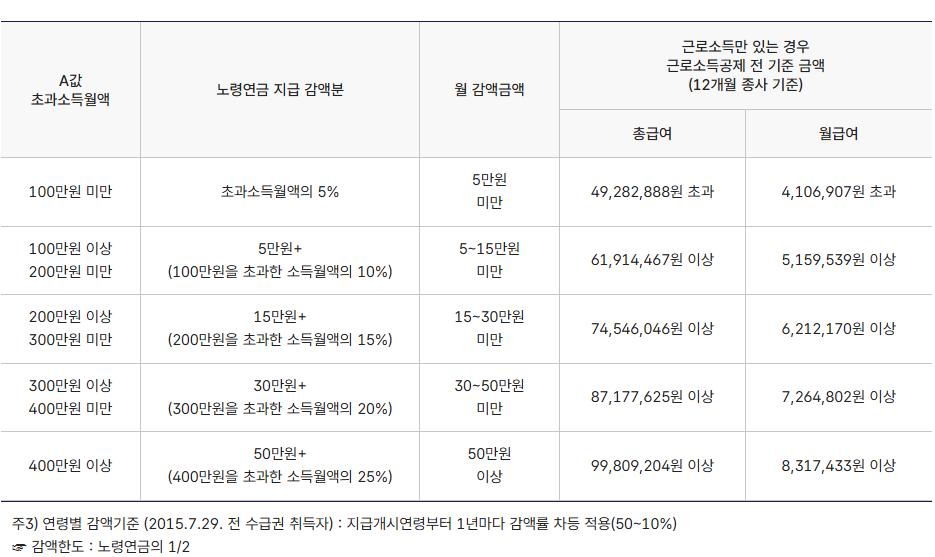 현재 감액 판단 기준이 되는 금액은 ‘근로소득공제·필요경비 공제 후 월 309만원 초과분’입니다.