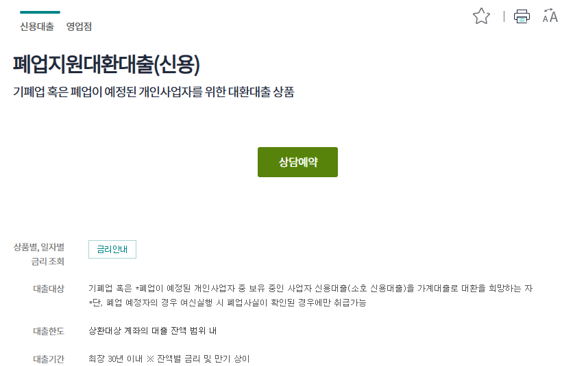 이 상품은 기폐업자 또는 폐업 예정자가 보유 중인 사업자 신용대출(소호 신용대출)을 가계대출로 전환하고자 할 때 이용할 수 있습니다.