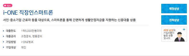 이 상품은 서민과 중소기업 근로자를 대상으로, 스마트폰 앱(i-ONE뱅크)을 통해 간편하게 실행되는 신용대출입니다.